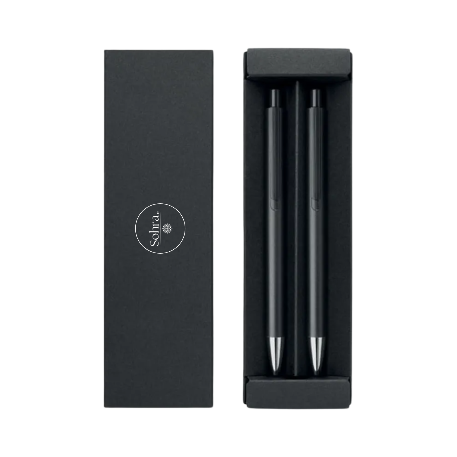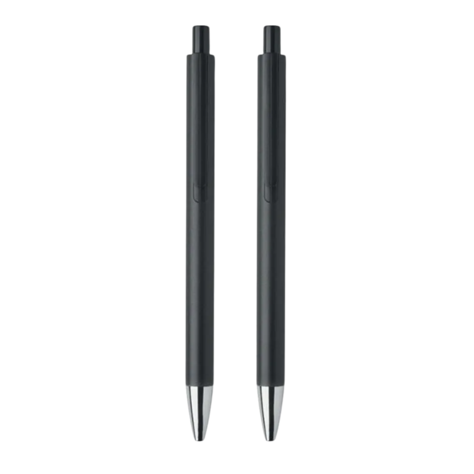 Realizat din aluminiu reciclat, acest set conține un stilou cu bilă, cu cerneală albastră, și un stilou grafit, ideal pentru notițe rapide sau schițe. Liniile simple și finisajul metalic îi oferă un aspect modern și rafinat, potrivit pentru birou, întâlniri sau momentele în care scrisul capătă un sens personal.